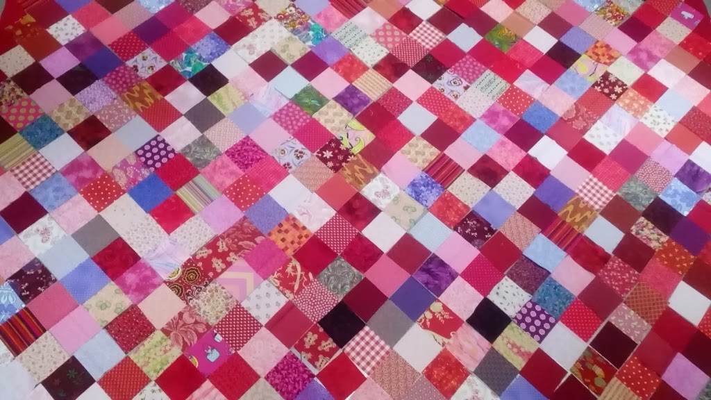Kijk, zo krijg je een aardig idee hoe hij er nu uitziet, ik heb lang lopen dubben over de achterkant, natuurlijk kan dat heel simpel, je koopt een lap groot genoeg en zet die er achter, maar dan loop ik tegen mijn voorraad aan, geloof me die hartjes hebben er geen deuk in geslagen, ik heb nog heel veel, ik heb lange tijd gedubt over of ik het aandurfde om wederom de voorraad aan te spreken om de achterkant te maken, afgelopen week ben ik begonnen met het snijden van de vierkantjes, er gingen zowaar lapjes op en er verdwenen heel veel restjes in de restjesbak waar ik graag in graai als ik met een projectje bezig ben. Voorraad is er nog genoeg, maar toch net weer wat minder. Ook de nieuw gesneden vierkantjes moeten uitgelegd worden voor een ietwat redelijke verdeling, en deze laten zich natuurlijk niet makkelijk fotograferen en zijn ook niet op te hangen want ze liggen nog los: