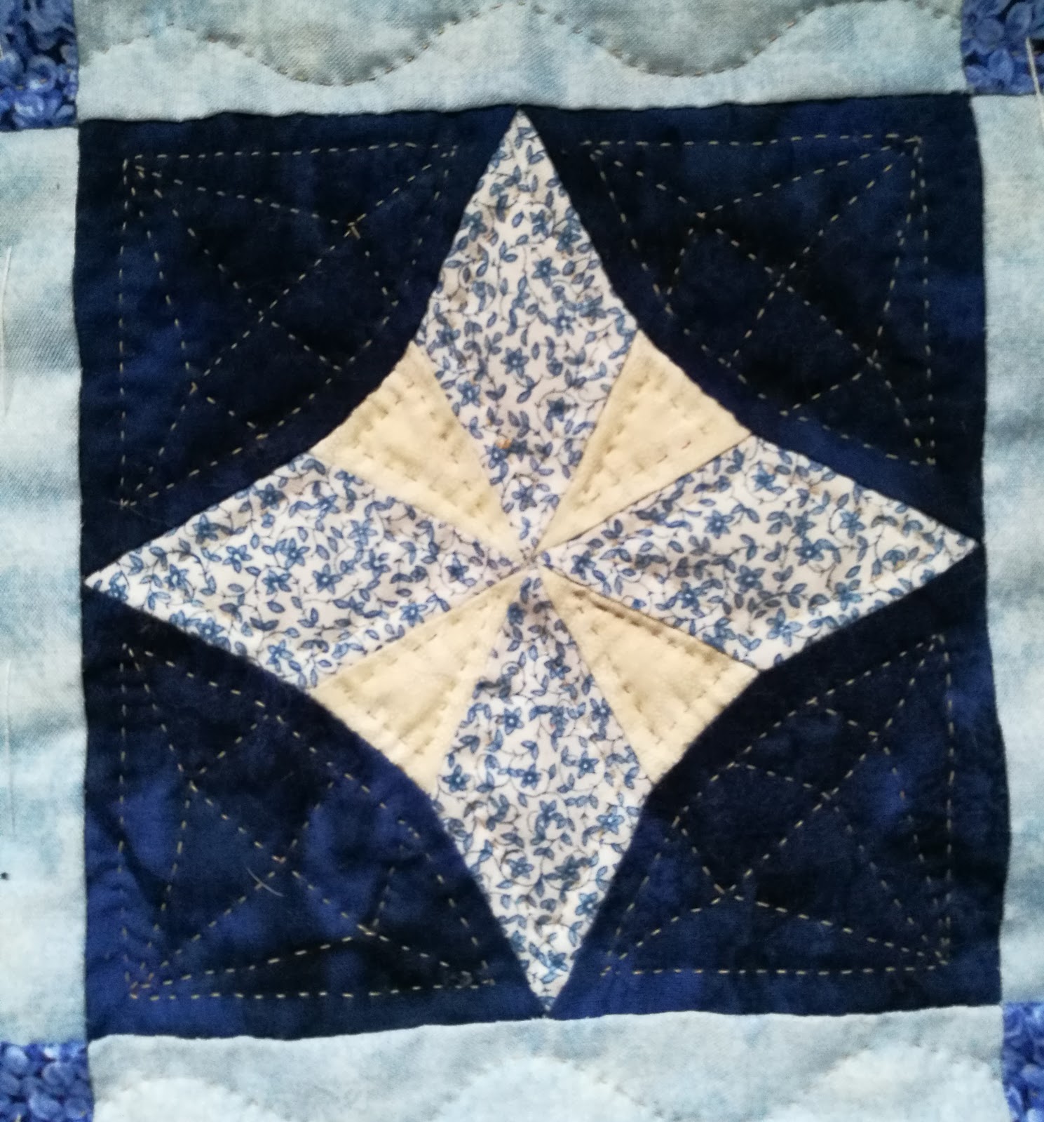 Ik was deze rij aan het eind begonnen en ik kan dus laten zien vanaf blok 3 in deze rij, blokken 1en 2 moet ik nog quilten.